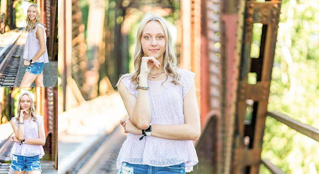 For Riley's session, we used multiple locations in Batesville and in Shelbyville. The first few locations were at Riley's Church, St. Louis Catholic Church and downtown Batesville with all the umbrellas (this was a must!) When I lived in Batesville, I always wanted to photograph someone in front of this Church, my dream came true, and I loved it! I loved Riley wanted a photo with her Bible too! And those umbrellas, we had to have a special photo! Riley is a dancer and has all the moves, so an aerial cartwheel was needed. Next location was a beautiful field with all golden sunlight! Then on to the river at Sunset Park in Shelbyville. Love river photos and Riley made my job easy here. The next location was an area in Shelbyville that has an old bridge/railroad tracks and other spots that are perfect for photos. To end the day, we headed to Blue River Park for a few photos. While we were waiting for the sun to set more for sunflower photos (those photos will be posted soon) we took advantage of the beautiful area back by the green bridge. Absolutely stunning! These photos of Riley were some of my favorites!